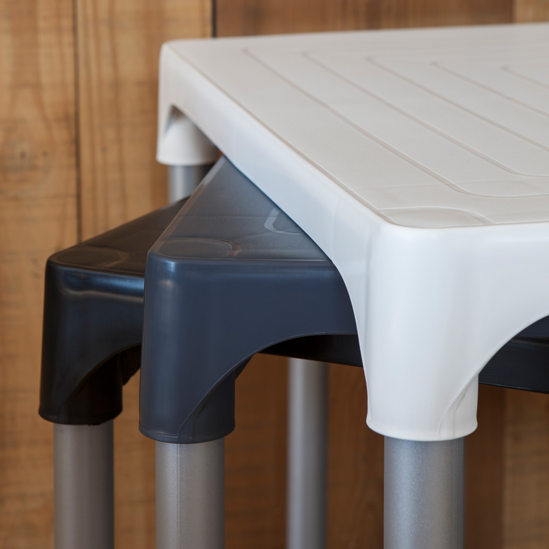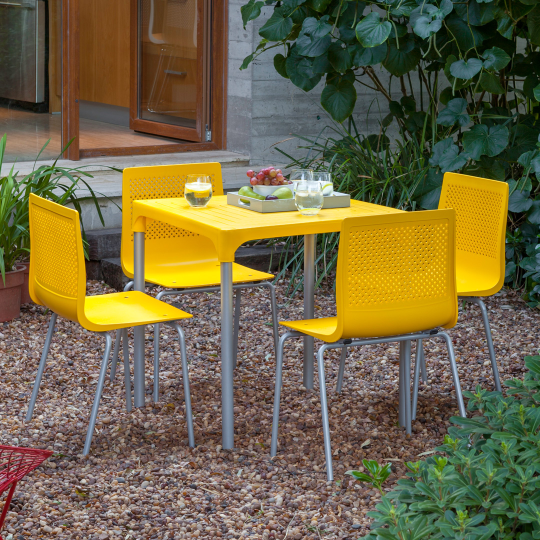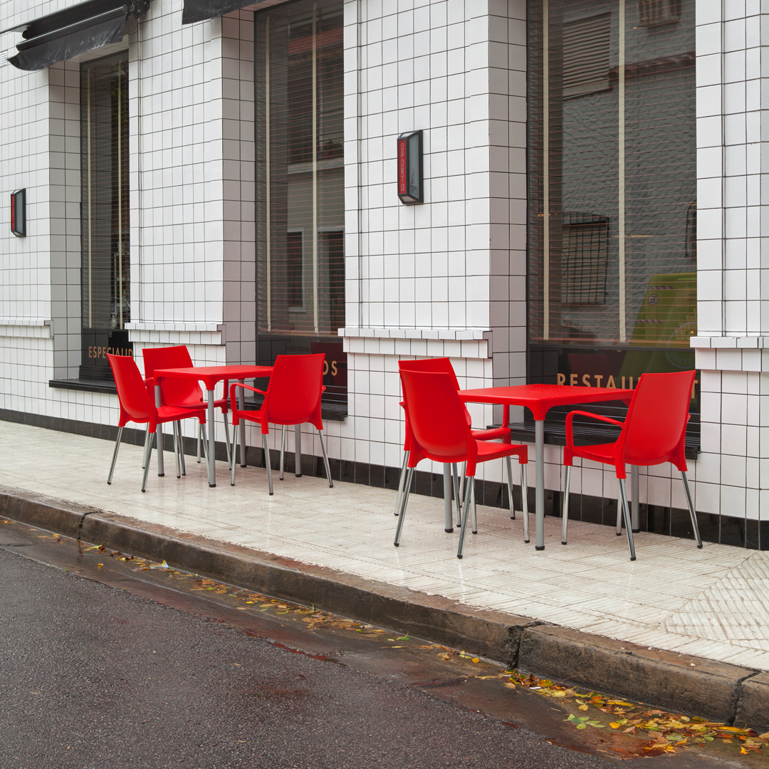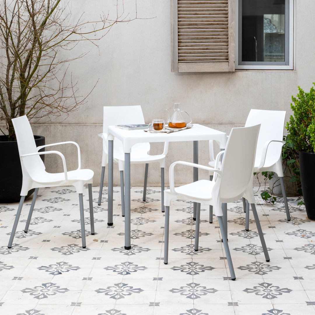 Ideal para exteriores, con base resistente de caño aluminio y tapa de plástico disponible en 7 colores. Duradera y fresca, la Mesa Lupe es perfecta para terrazas, patios y espacios al aire libre, ofreciendo funcionalidad y estilo.